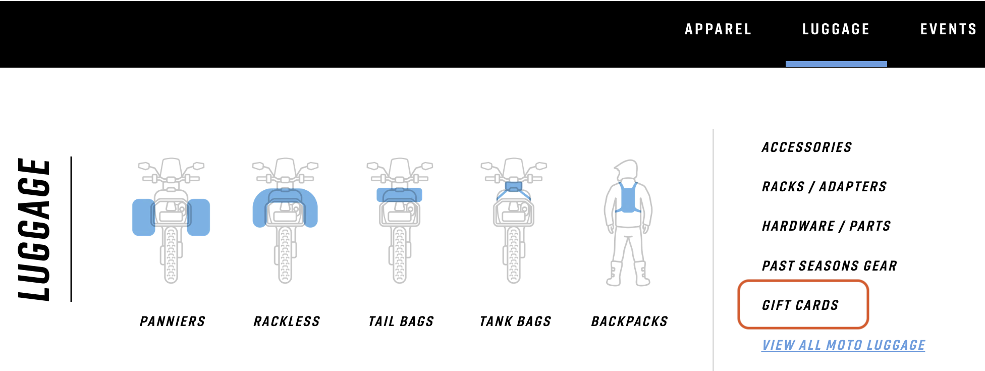 - Hover over the Luggage collection, and the option for Gift Card will be in the drop-down menu.